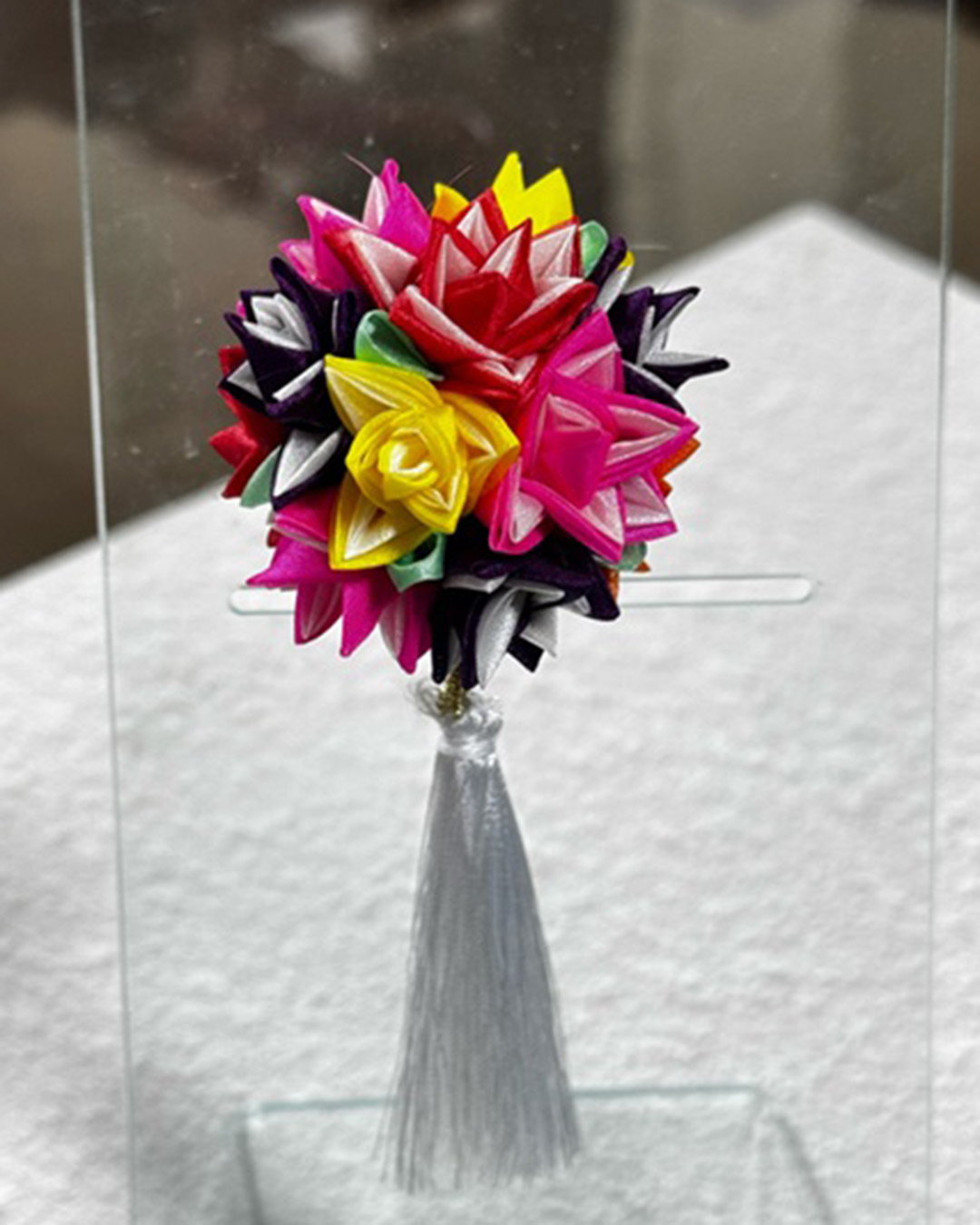 球体の中にぴったりと並んだ角バラがとても可愛い作品です。5月の講座角バラのかんざしと組み合わせることのできる作品になっています。お待ちしています。